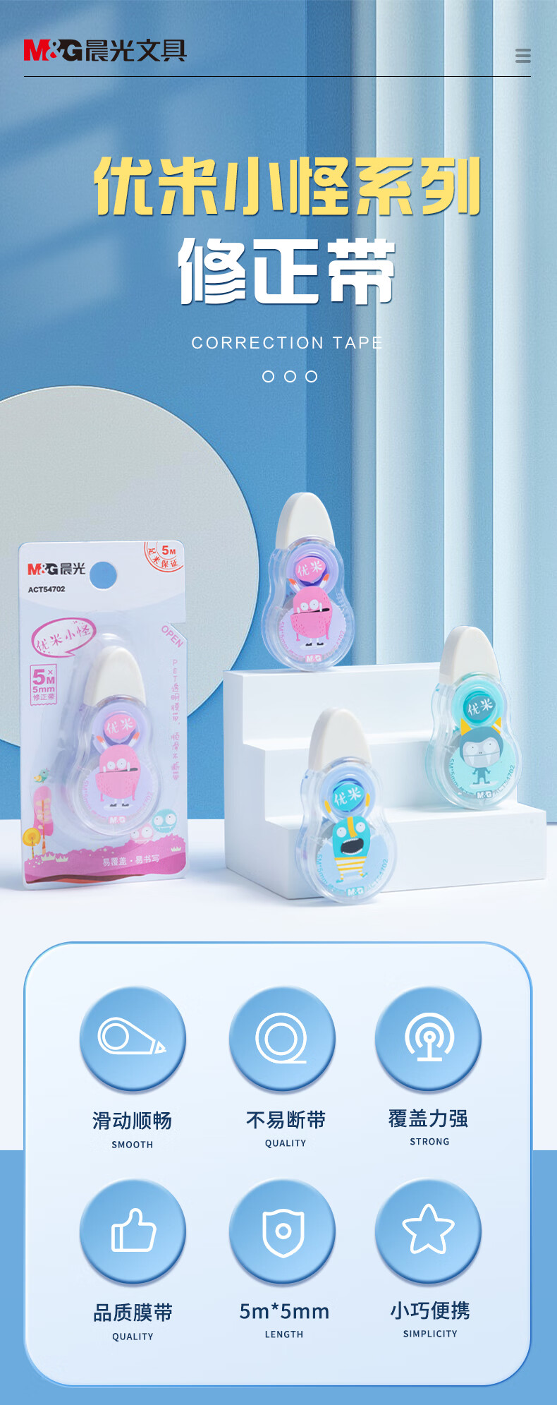 修正带>晨光/M&G ACT54702 办公消耗用品-文教用品-文具-修正液/修正带/修正贴-5m*5mm高颜值便携修正带 学生涂改带 优米小怪系列改正带 10个装
