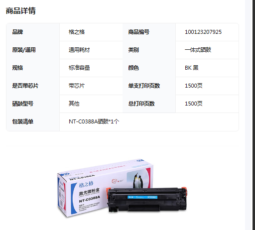 当前位置: 首页>耗材>硒鼓粉盒>粉盒>格之格G&GNT-C0388A办公消耗用品-硒鼓、粉盒-粉盒-适用 HP Laserjet P1007/P1008/1106/1108/M126a/M126nw/