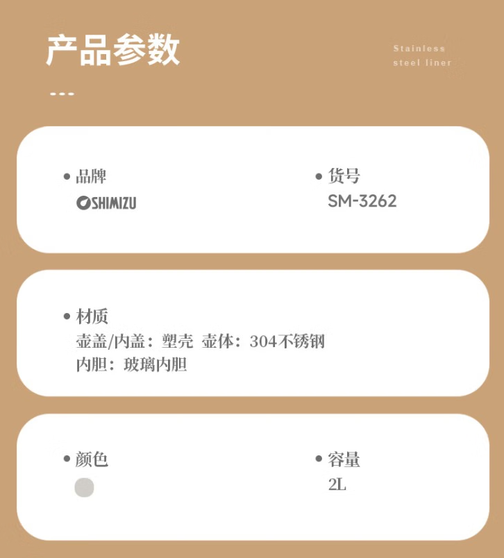 清水 SM-3262 壶 不锈钢热水瓶玻璃内胆保温壶 2L