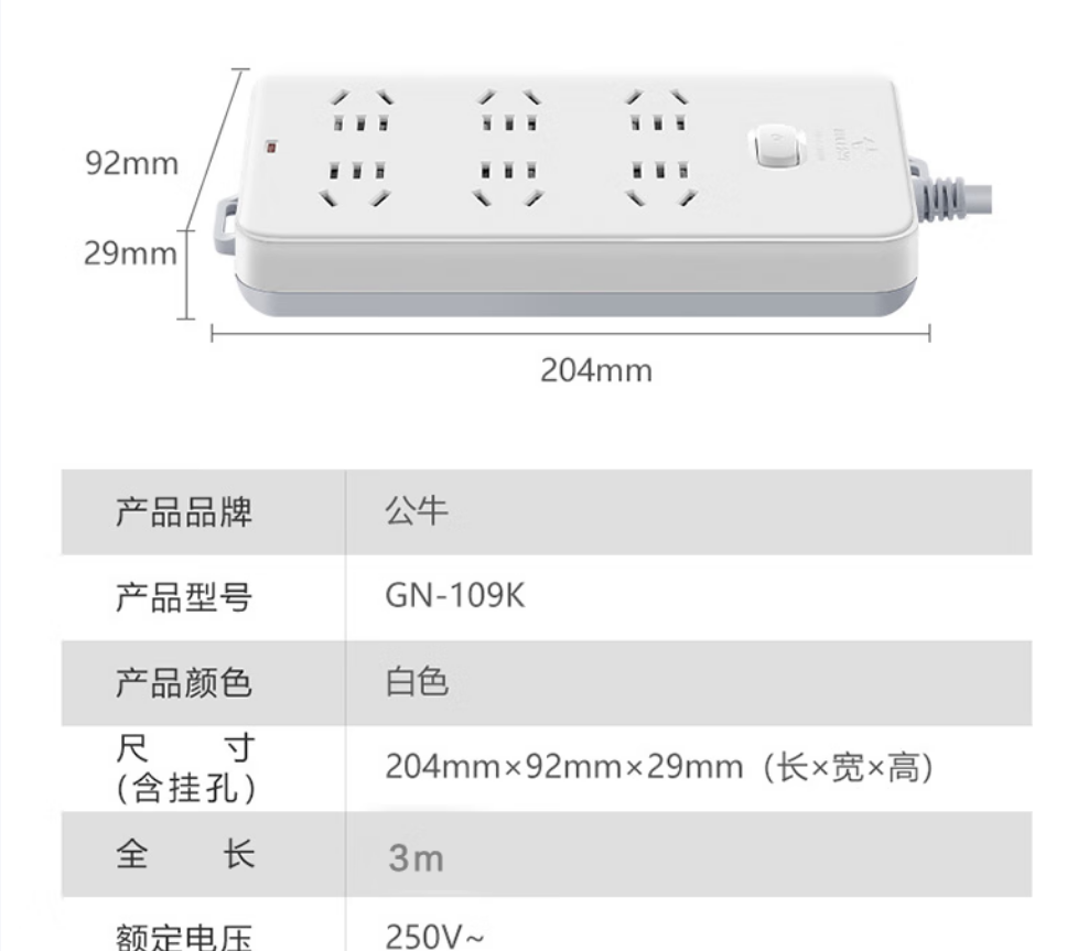 >公牛 GN-109K. 插座 插线板 6位总控全长3米